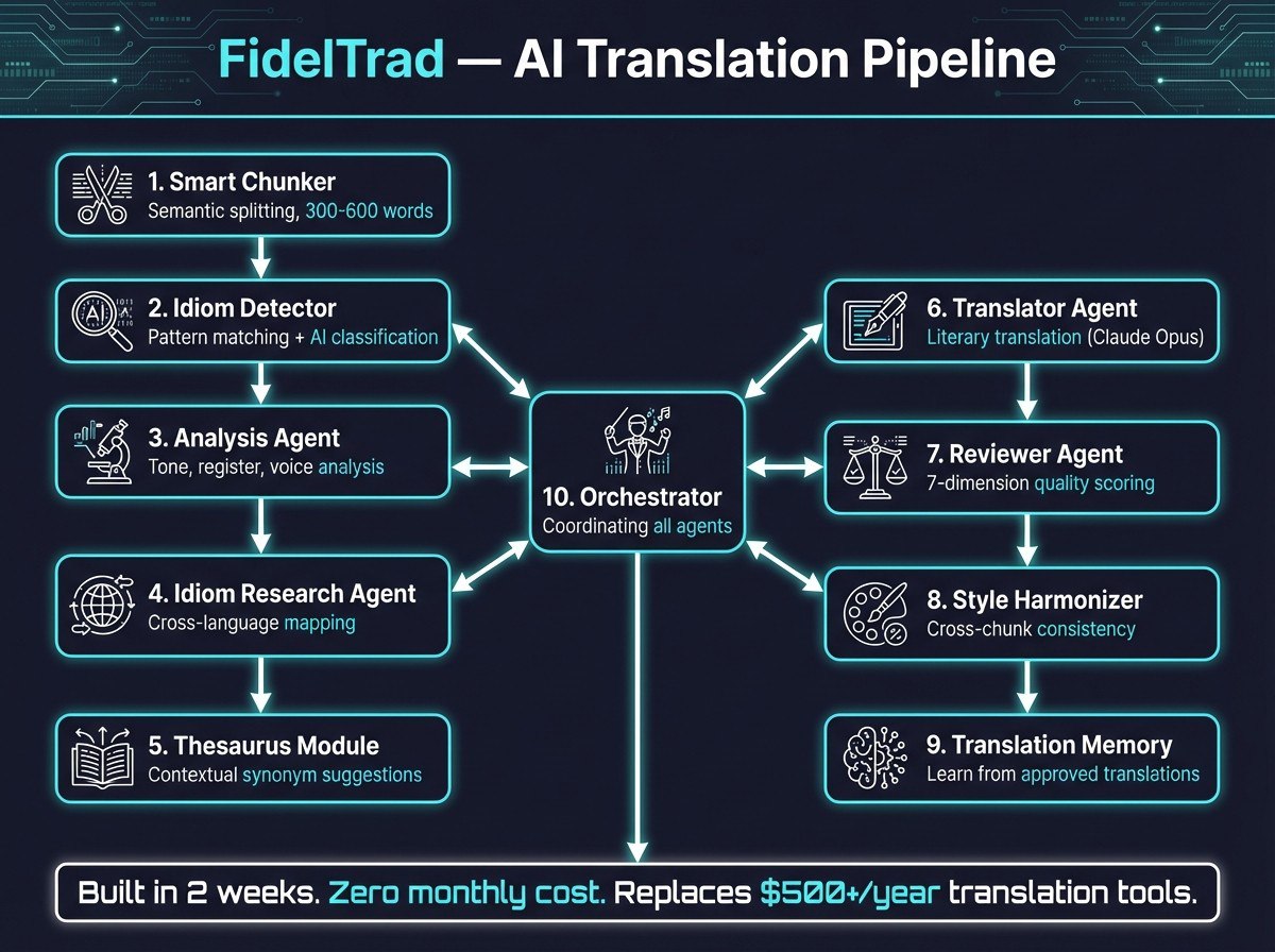 Six months ago, I built FidelTrad, an AI-powered book translation tool. Not because I'm a linguist or because I saw a market opportunity, but because I had a specific problem: I wrote a book in English and wanted to translate it into French, German, Portuguese, and Spanish. Getting quotes from human translators? Per language, per book — it would have cost me my eyeballs. We're talking thousands per language, months of back-and-forth, and no guarantee they'd nail the nuance.