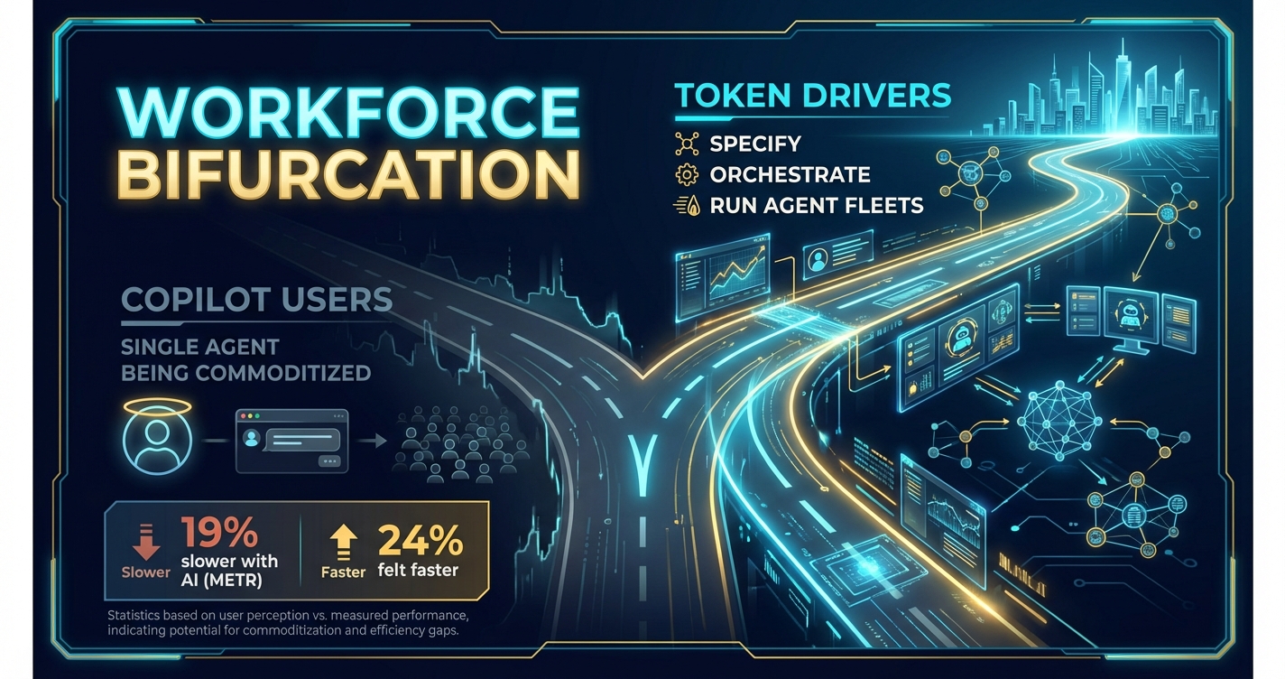 High-value "token drivers" who specify precisely, architect systems, and manage agent fleets. They're seeing explosive revenue per employee—companies like Cursor at $16 million per employee, Midjourney at $200 million with just 11 people.